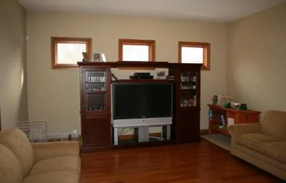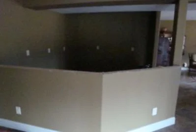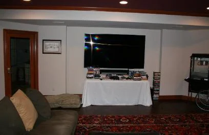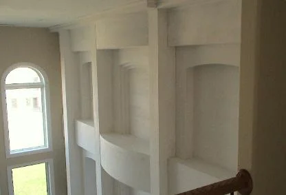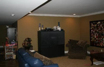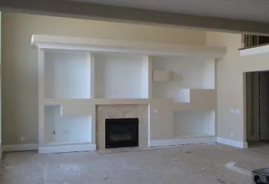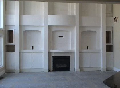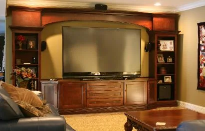 This theater room was just completed. Before it was a niche where the TV was set. Now it’s an elegant, tasteful surround and media/compnent storage unit that makes the room look finished.