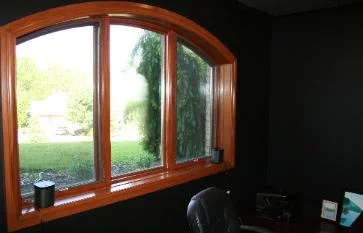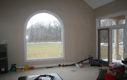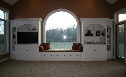 This wall system is a wonderful example of how a room was changed from a space that was used to an elegant focal point that has made the room useful as well. The arched cabinet on the left incorporates built in cable and audio connectors. As well both right and left units have pull-out shelves and all the doors have quiet close hinges. While our work created a breathtaking addition we must include that the walls and carpet were redone and all the design work was performed by Lisa Crouch of iDesign located here in Dayton.