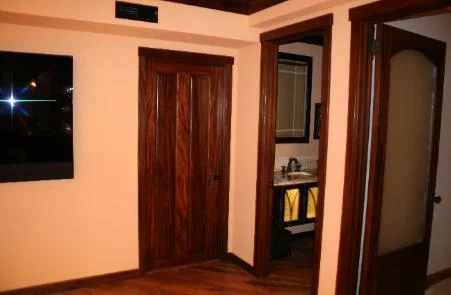 Looking the other way we see the entrance to the bar, the bath and a storage room. We specially select the grain for all our projects but in this the panels are all a beautiful ribbon laced grain
