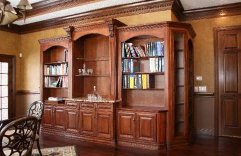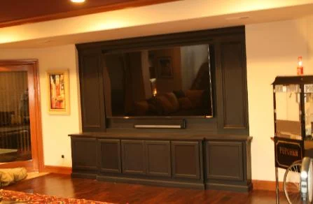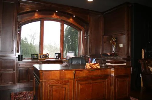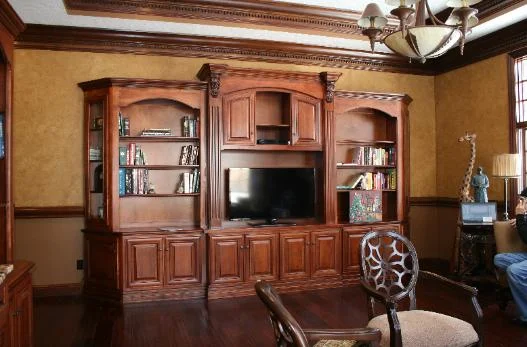 This home office, theater cabinets and beam mantle were two projects we just completed in home at Country Club of the North. The beams were repurposed, originally part of a barn built between 1850-1875. A lot of handwork and even holes where the barn was held together by wooden pegs. The theater room we gave a nice, subtle depth with the side paneling. The home office was a bit of a challenge the arched soffits requiring more thought and planning. We included dimmable display lighting, soft close hardware and carefully selected all grain. Lighting was from the window and overwhelming, this shows off our limited photography skills.